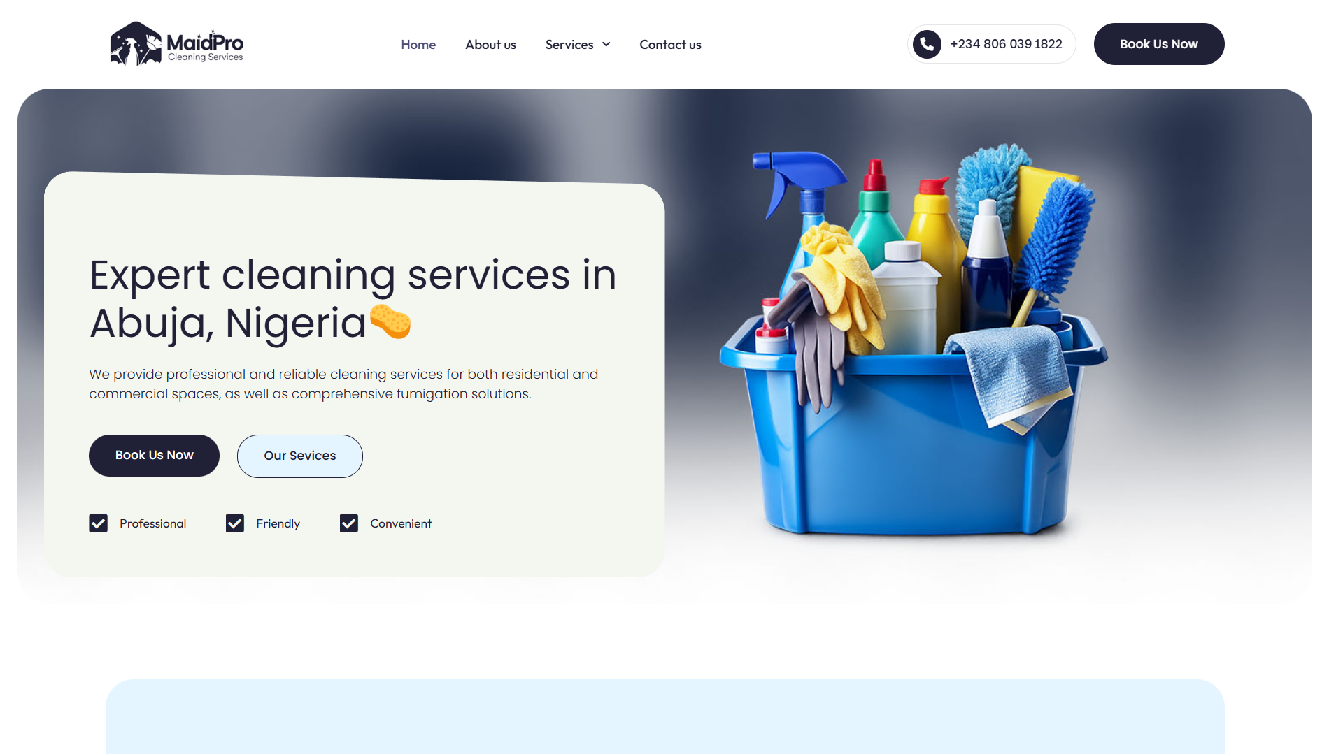We designed and developed a modern, conversion-focused website for MaidPro Cleaning Services, a professional cleaning company based in Abuja, Nigeria.