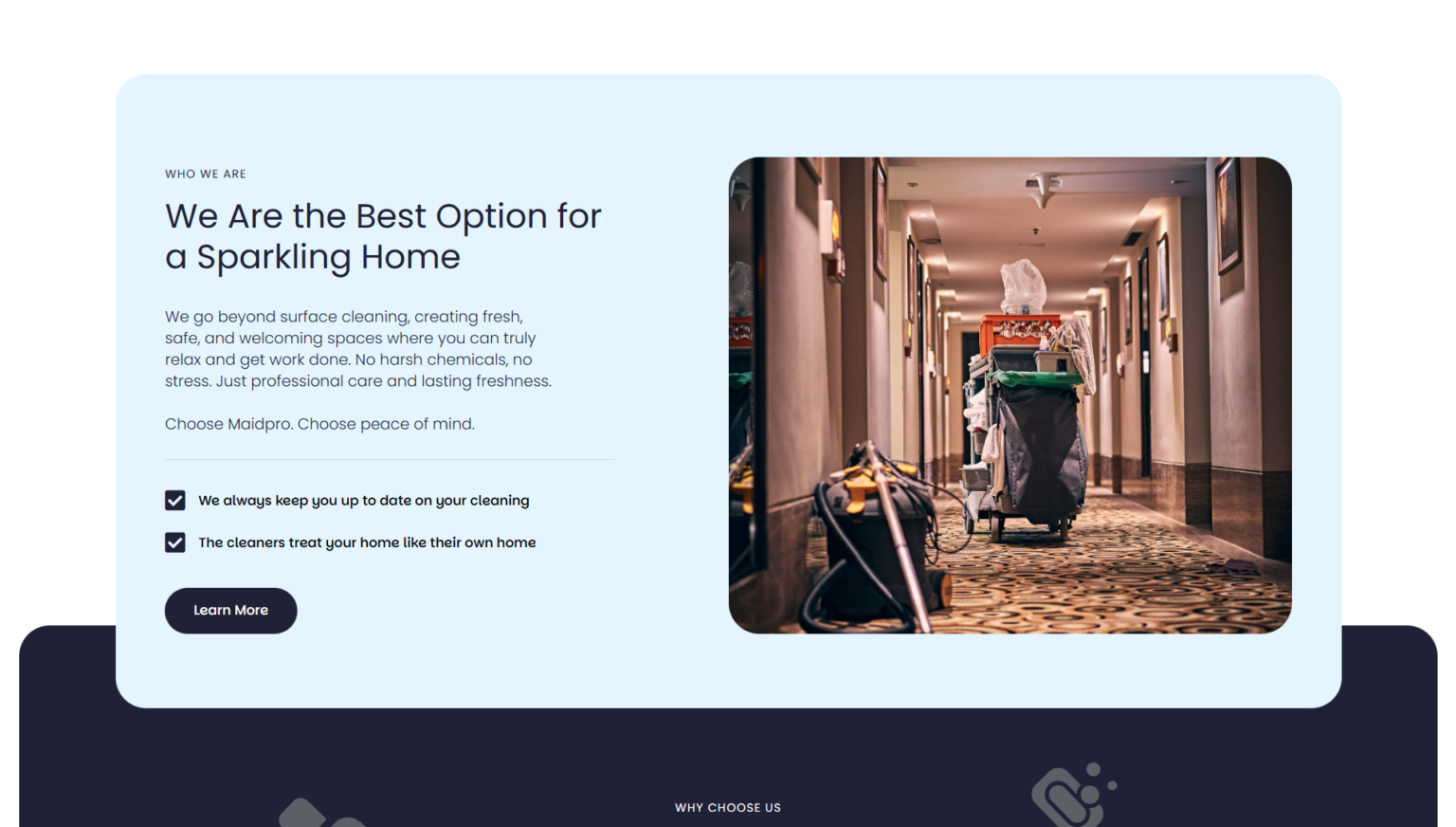 Each service is clearly presented with a learn more option to guide users deeper into the website.